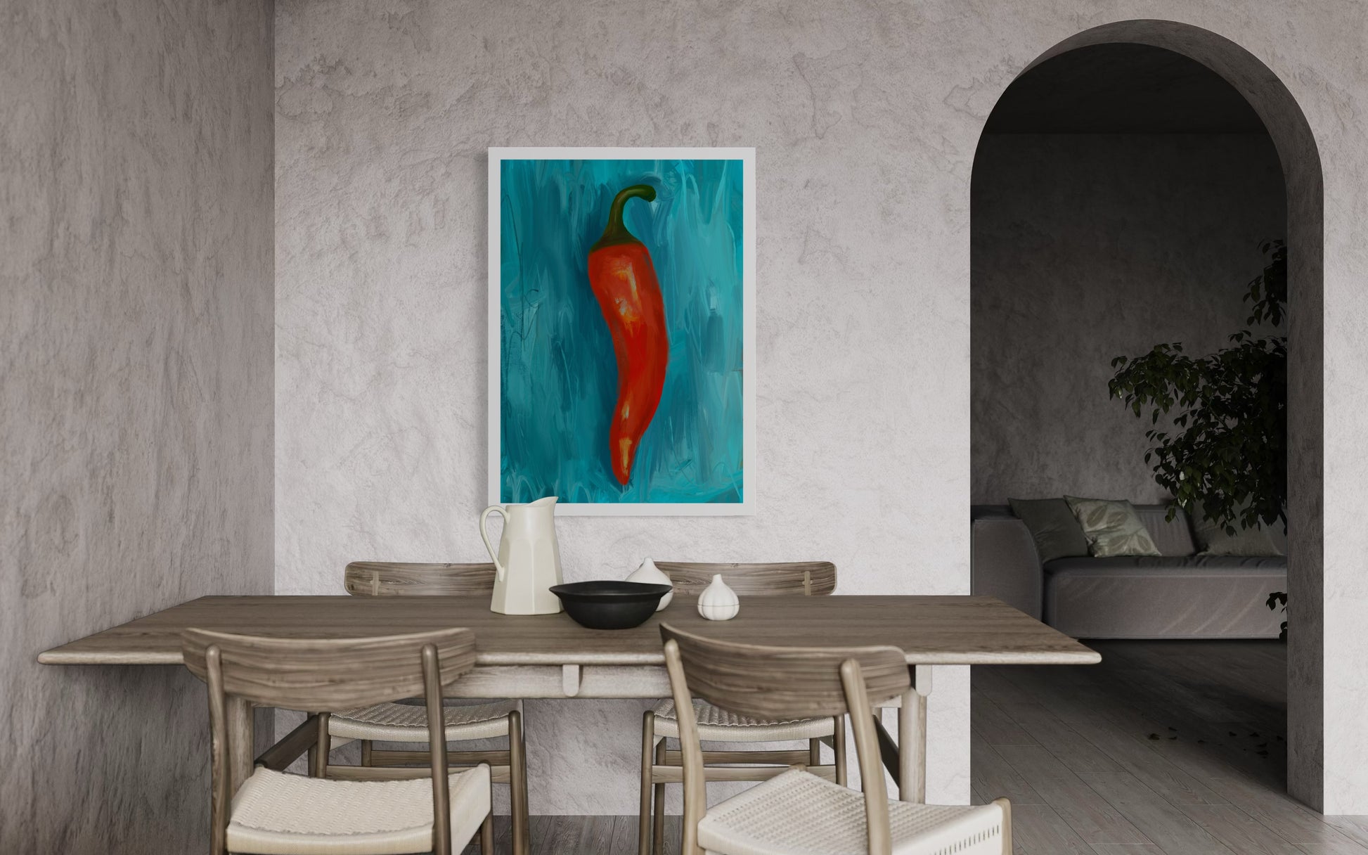 A fiery red chilli set against a cool, textured aqua background—where spice meets calm, and warm and cool tones balance beautifully.